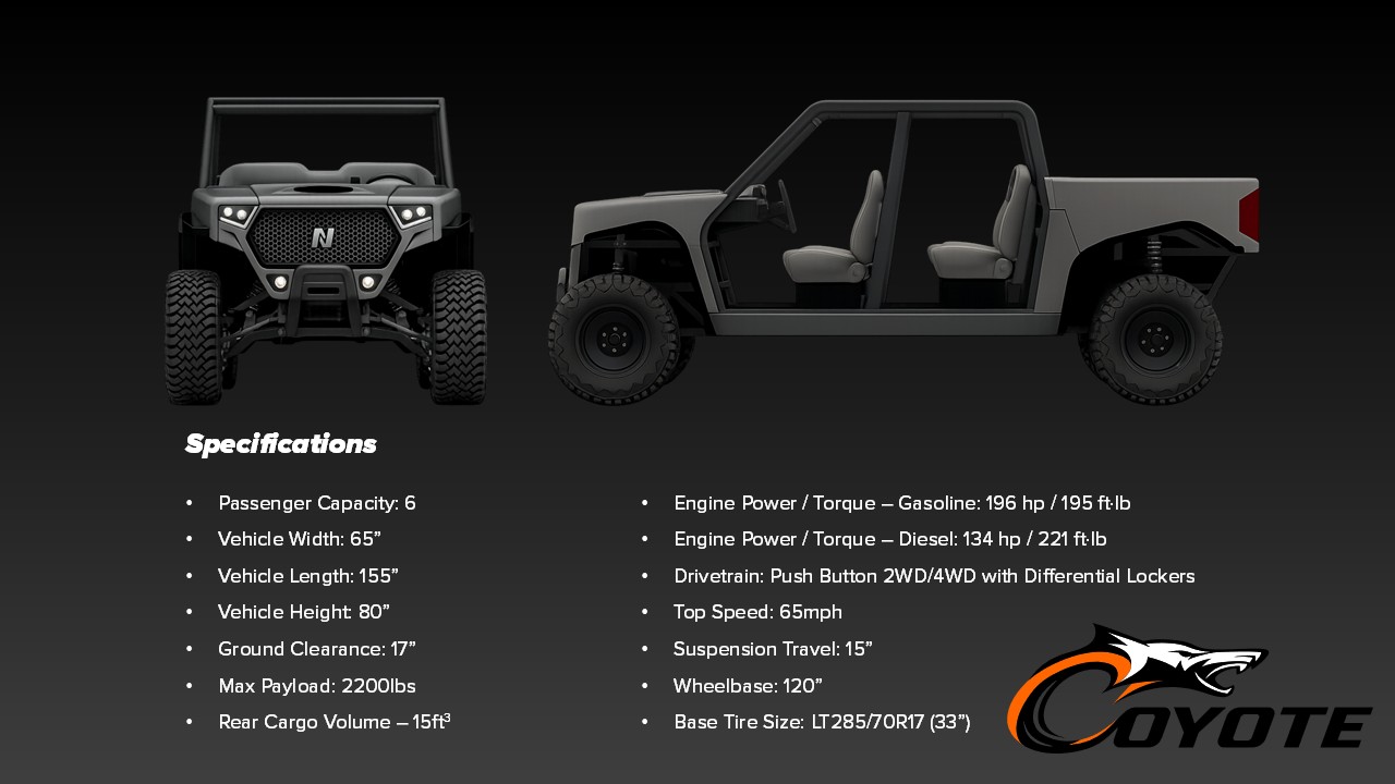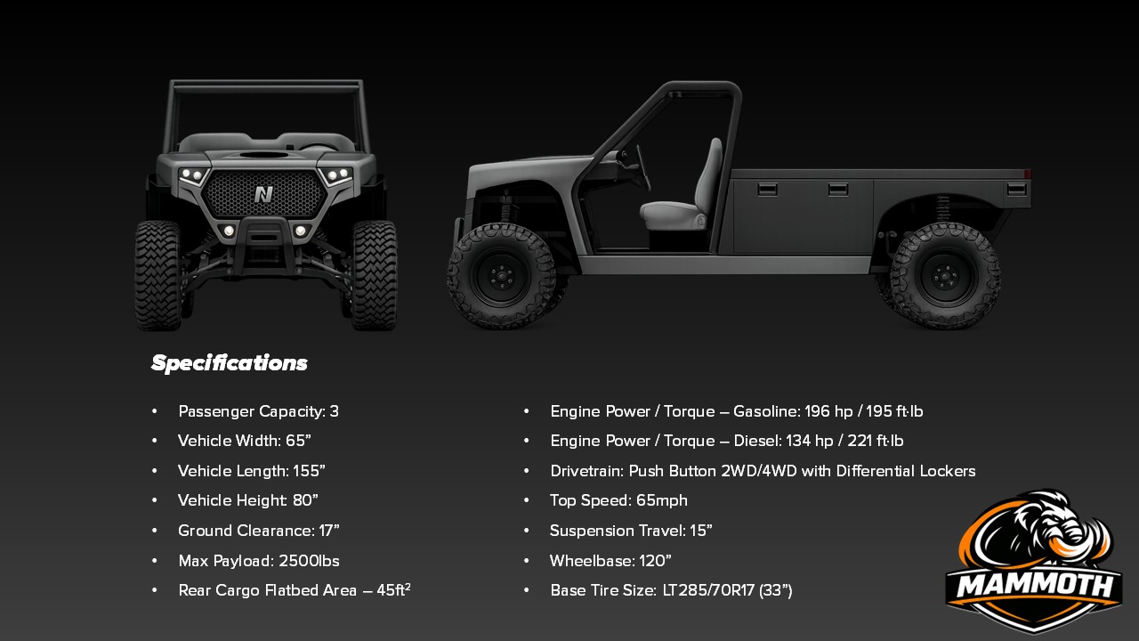 NOMAD SXS (side by side) is a start-up formed by a heavily experienced group of engineering, manufacturing, and business development leaders within the powersports industry. They have identified a great opportunity in several underserved and high value corners of the North American SXS market. Ranchers, mining operations, construction trades, utilities, law enforcement, federal / state / local governments, and military have a strong need for a multi-fuel (gasoline & diesel), ultra-durable vehicle with high payload capacity that can handle extreme terrain and environments with safety, stability, and ease of operation.